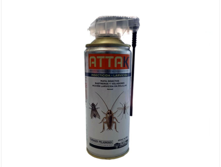 ATTAK® CON CÁNULA es un aerosol insecticida eficaz para el control de insectos voladores (moscas, polillas, mosquitos, avispas, tábanos), insectos rastreros (cucarachas, hormigas, garrapatas, grillos, pulgas, arañas, chinches, escarabajos de las alfombras) e insectos en interiores y exteriores.Gracias a su exclusiva formulación, ATTAK® CON CÁNULA posee acción de desalojo sobre los insectos, obligándolos a salir de sus refugios o escondites y exponiéndolos a la acción insecticida. Además, posee mayor potencia insecticida porque combina dos modos de acción diferentes con un agente sinergizante.