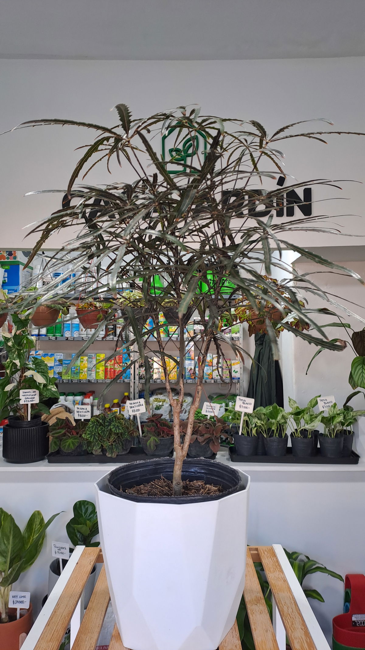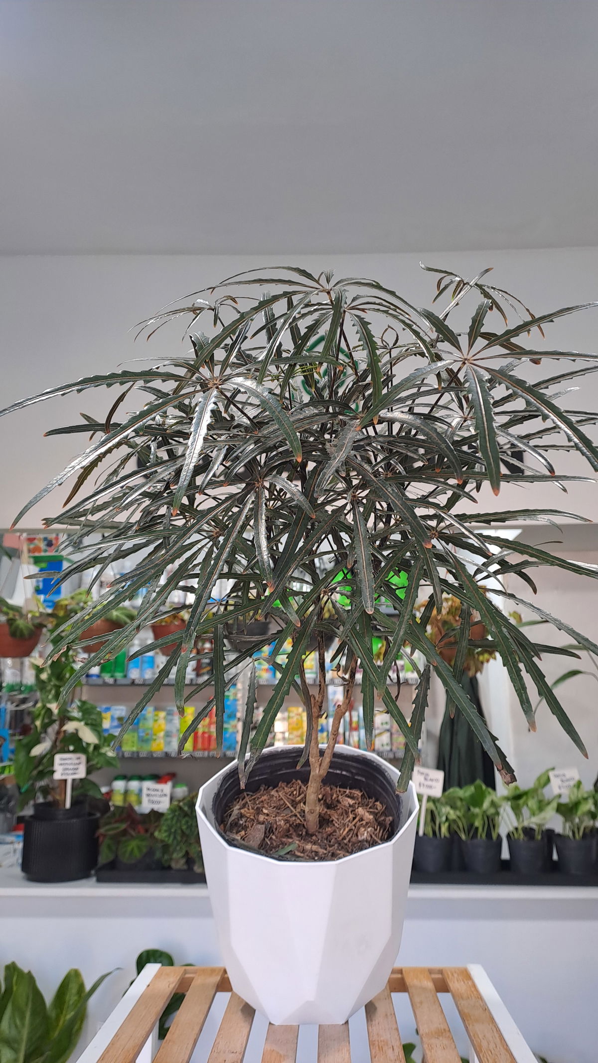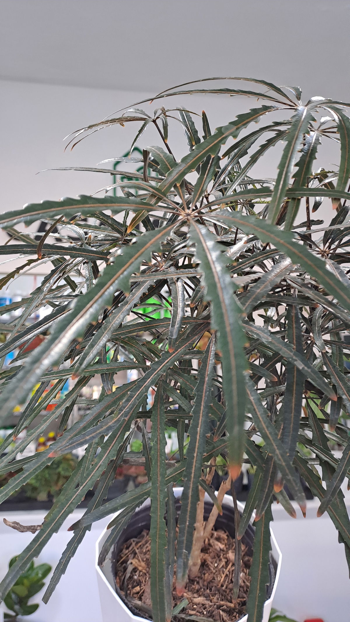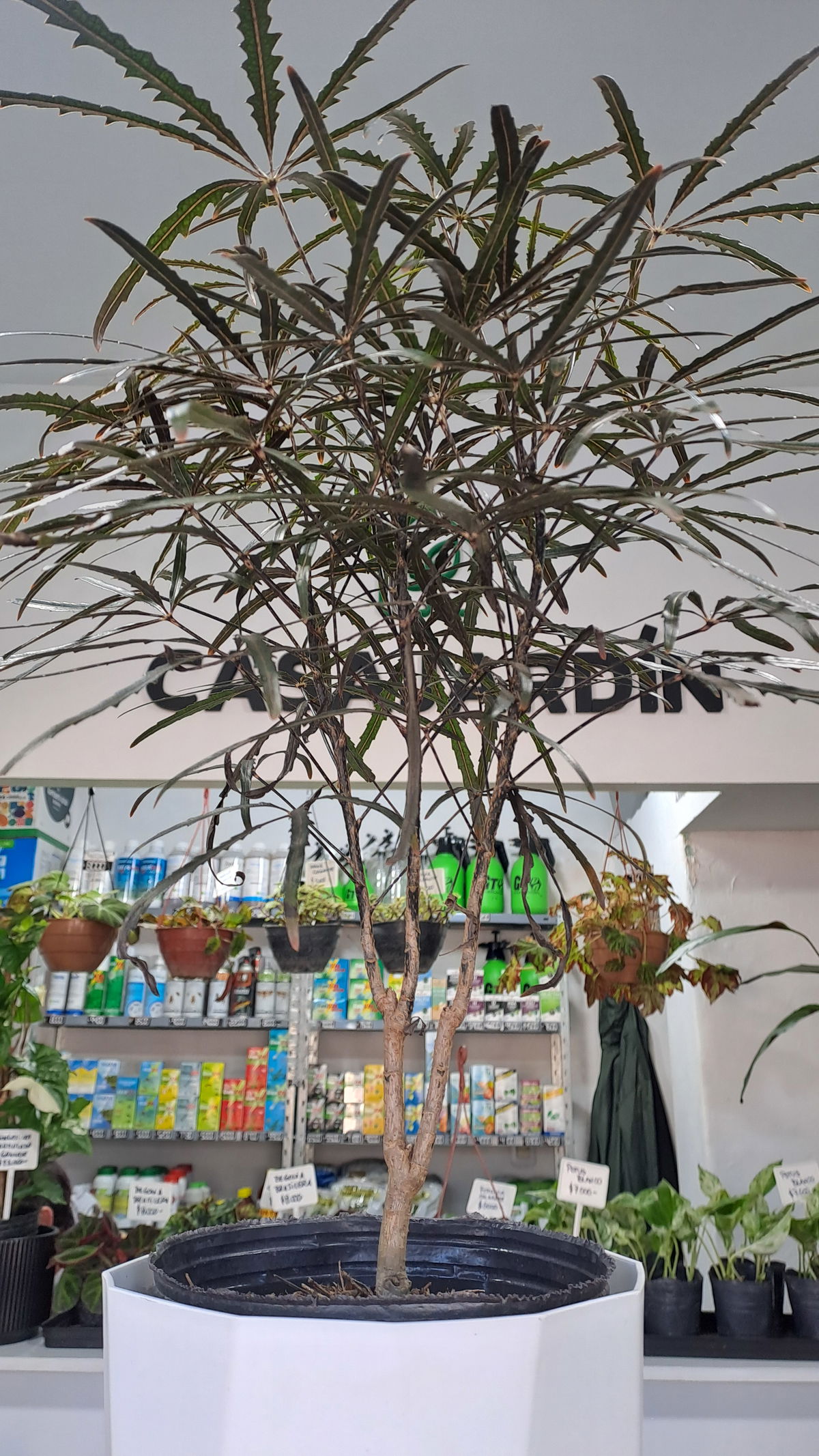 La Aralia Elegantísima, también llamada falsa aralia, es un elegante arbusto con múltiples tallos finos vestidos con hojas finas y estrechas de color marrón oscuro, llegando casi a color negro. La forma de los tallos y las hojas tan finas dan sensación de ser una planta muy delicada, pero en realidad es una planta de interior muy resistente, que además ofrece muchas opciones decorativas.