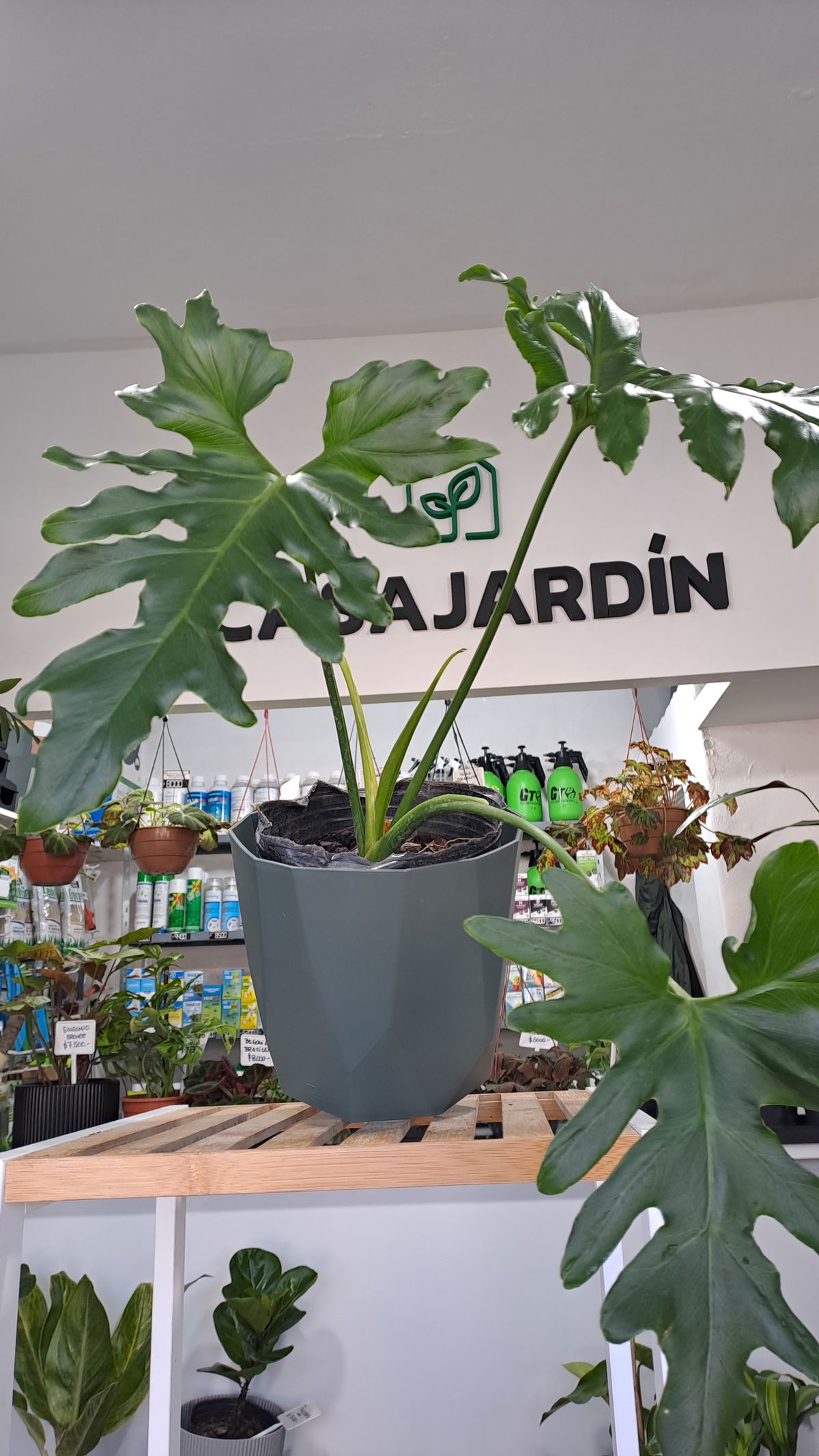 - Hojas: Sus hojas son grandes, lobuladas y de color verde oscuro intenso.