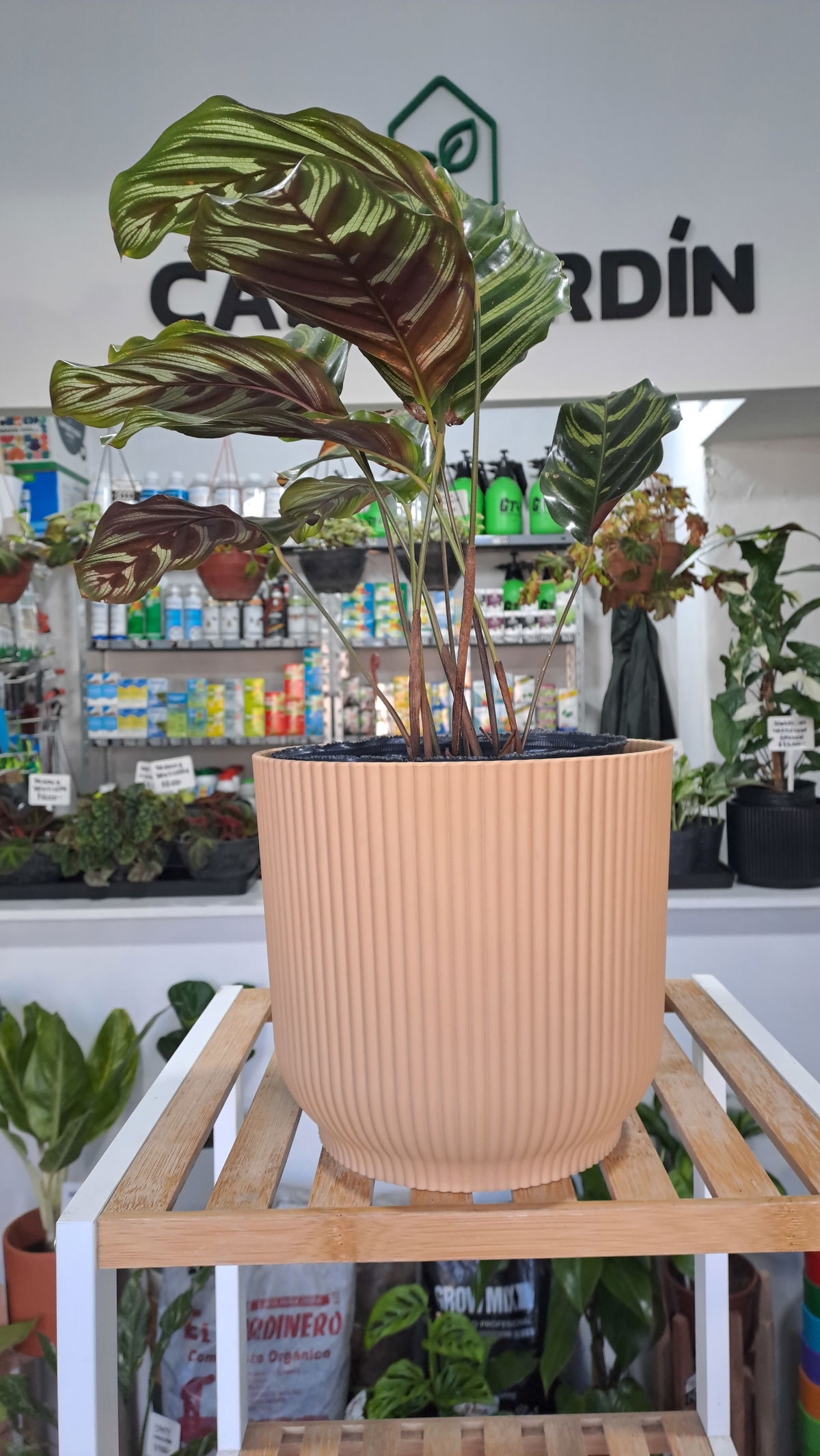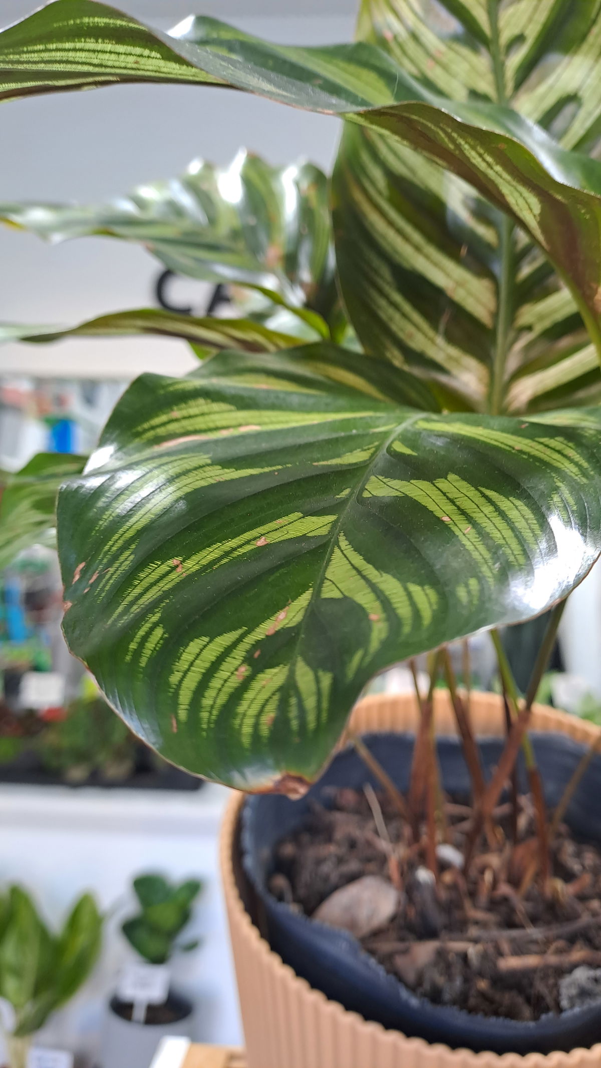La calathea makoyana, también conocida como planta del pavo real, es una planta perenne originaria de Brasil que se caracteriza por sus hojas ovaladas y sus manchas y rayas de color verde oscuro: