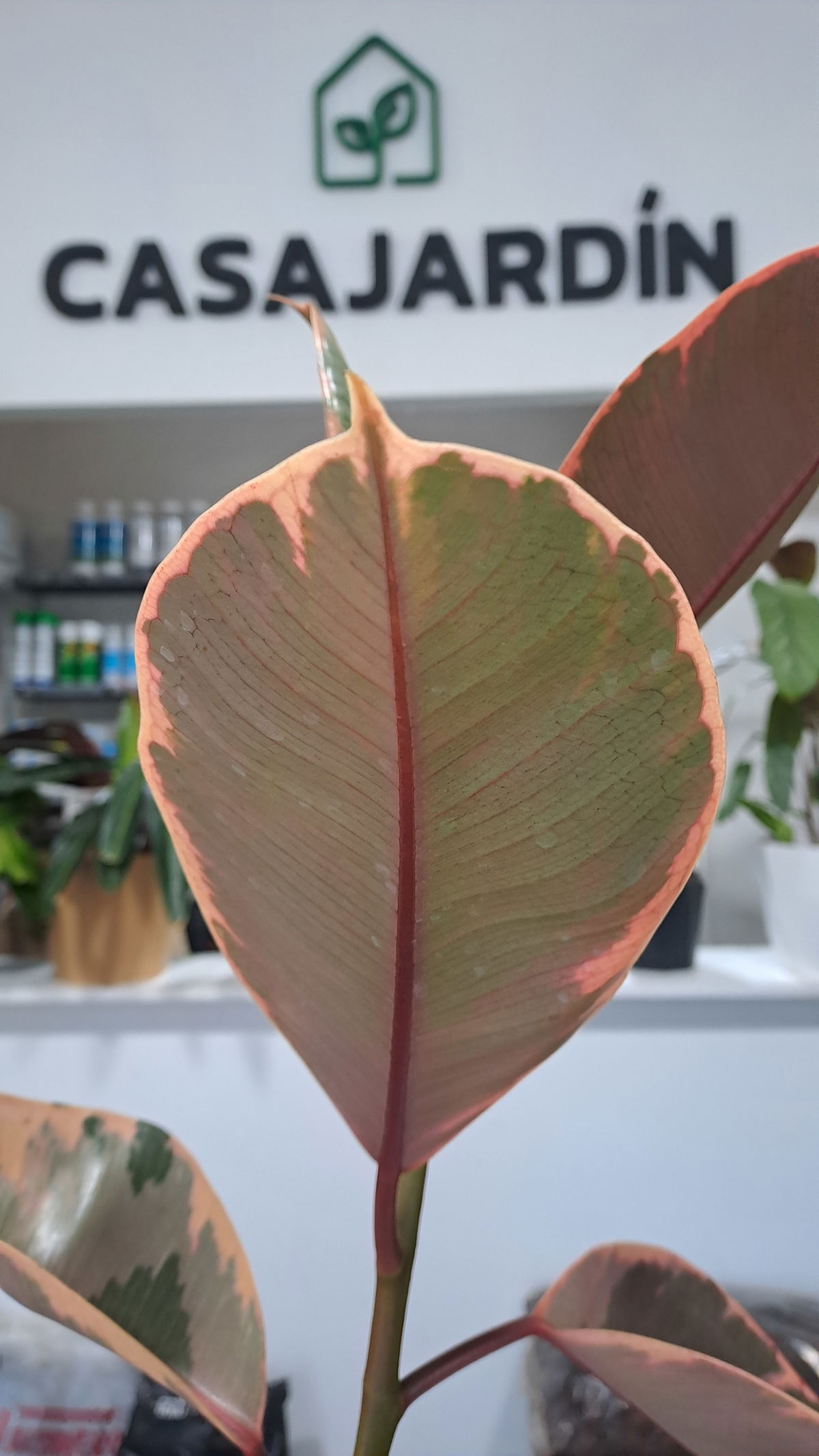 El Ficus Elastica Ruby, o "Gomero Rubí", es una variedad del Ficus Elástica (árbol de caucho) conocida por sus hojas grandes y brillantes con tonos rojizos, que pueden variar desde el verde con tonos rosados en hojas jóvenes hasta el verde con tonos blancos o crema en hojas más maduras. Es una planta de interior popular por su fácil cuidado y su aspecto decorativo.