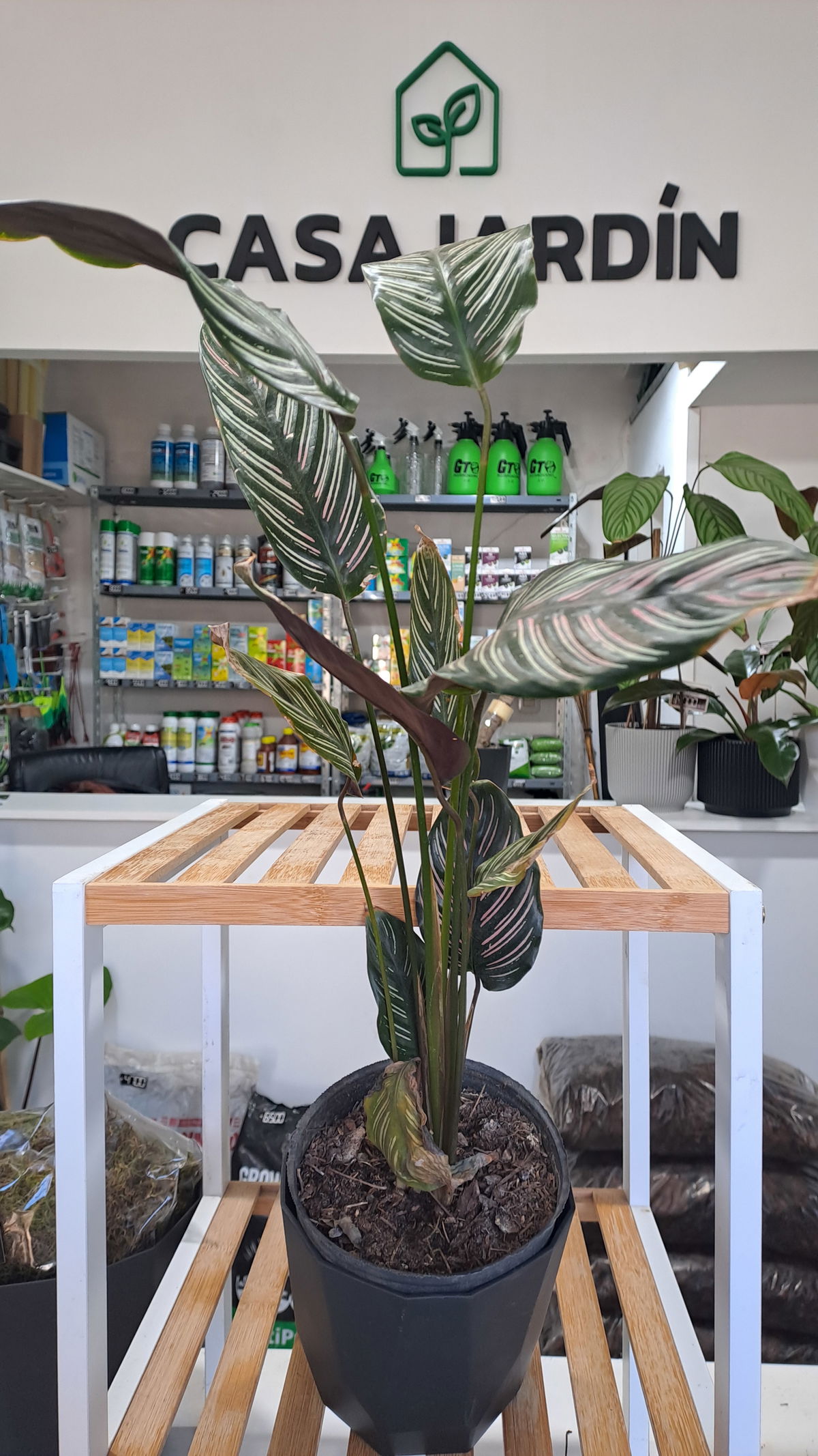 Descripción: Planta tropical de hojas alargadas con rayas blancas o plateadas que contrastan con un fondo verde oscuro. Ideal para interiores luminosos sin sol directo.