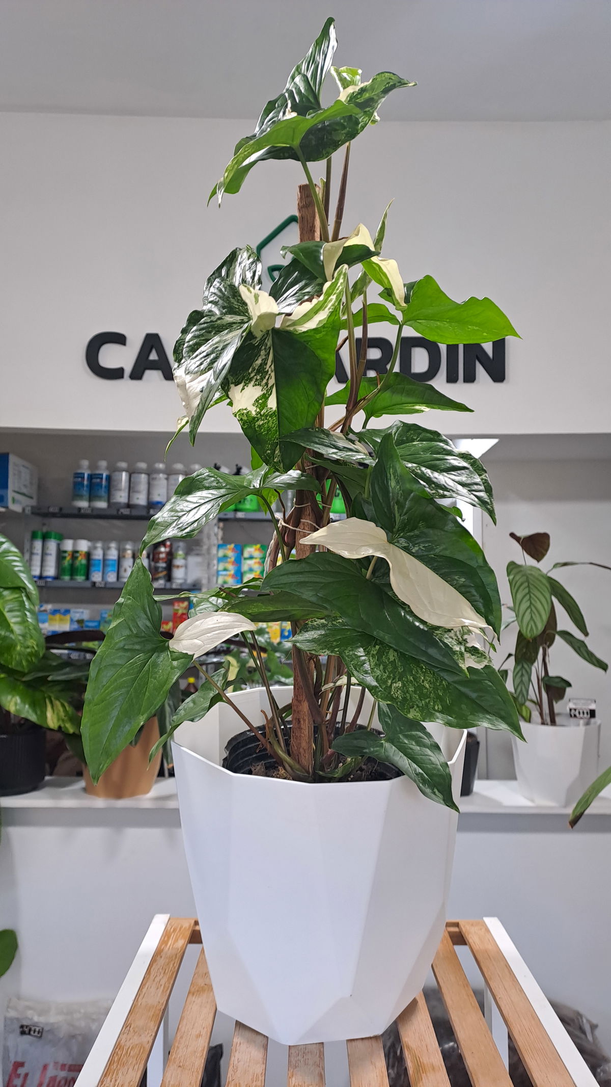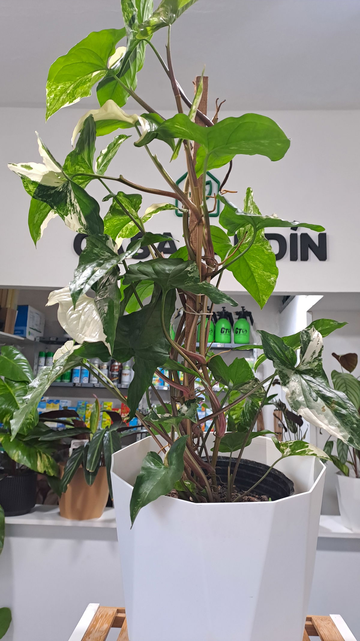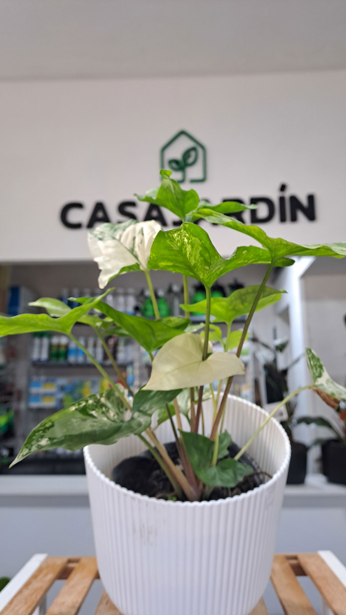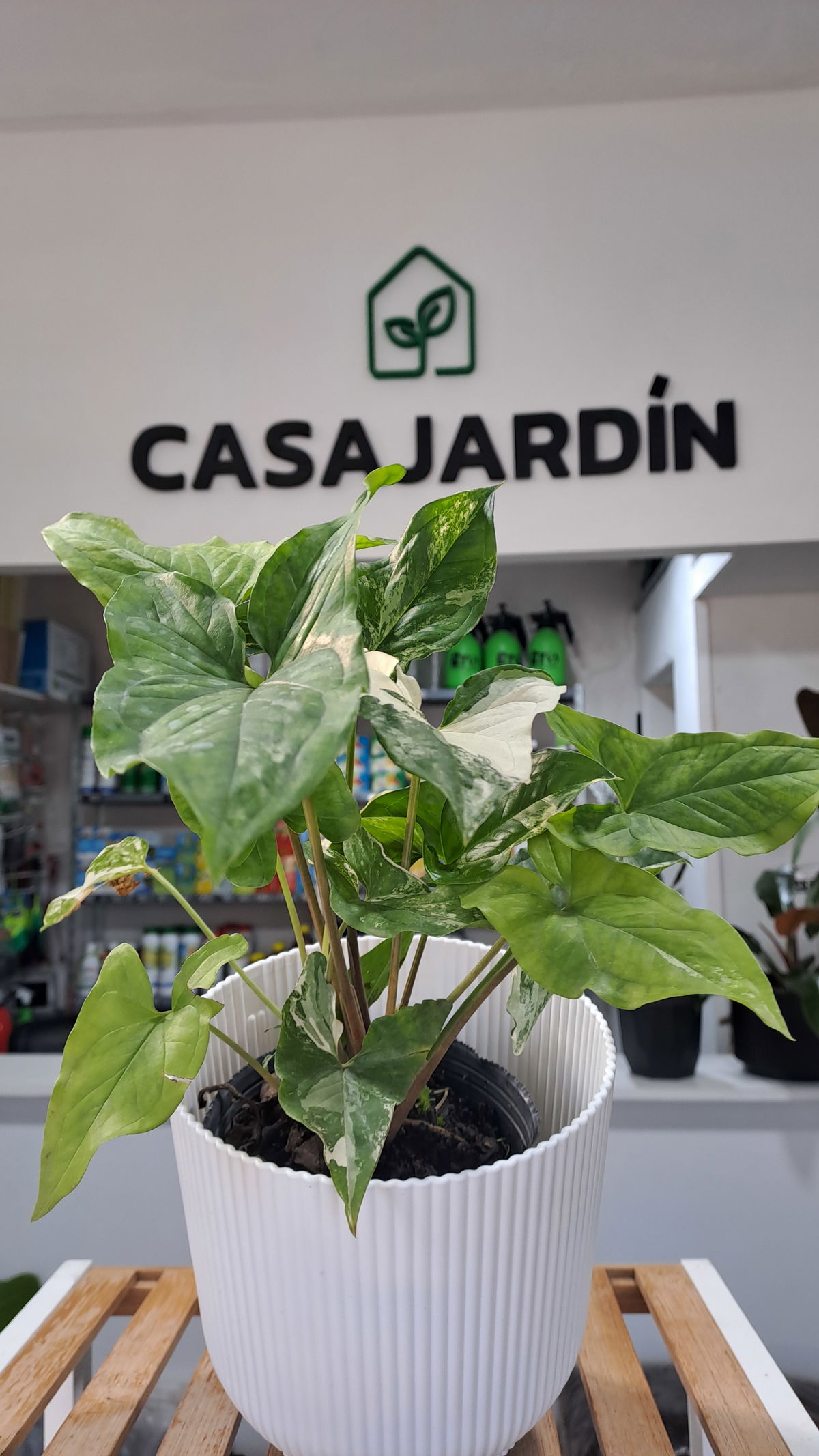 Descripción: Variedad de singonio con hojas jaspeadas de verde y blanco. Muy atractiva por su patrón marmolado.