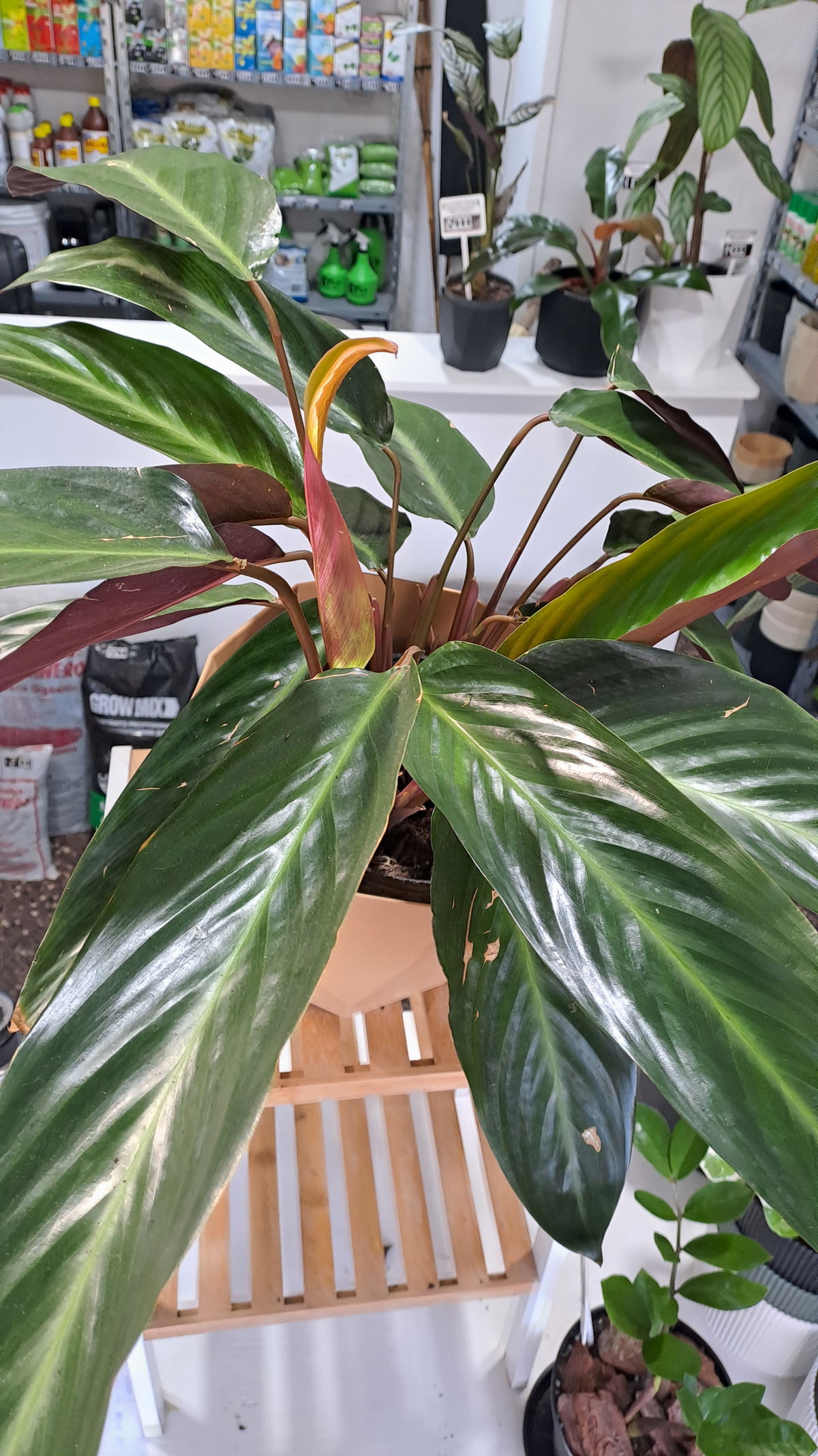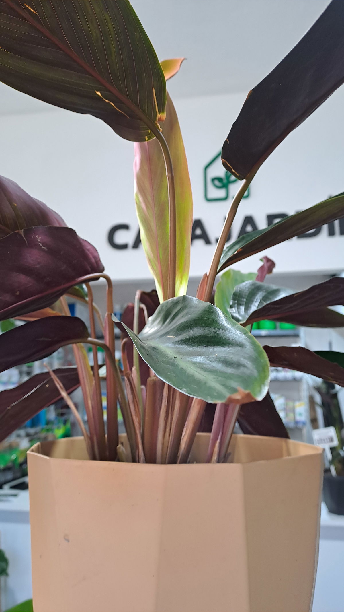 Planta de follaje oscuro con tonos granates, verdes y blancos. Muy decorativa y de aspecto tropical.