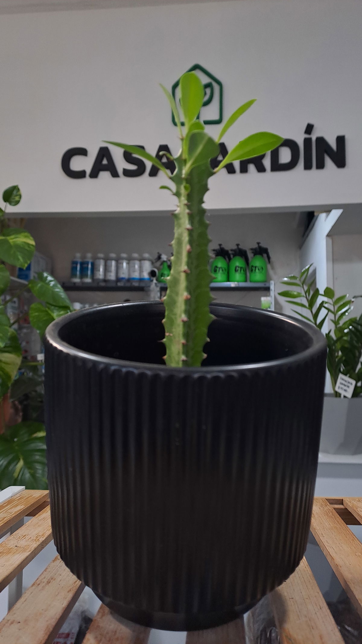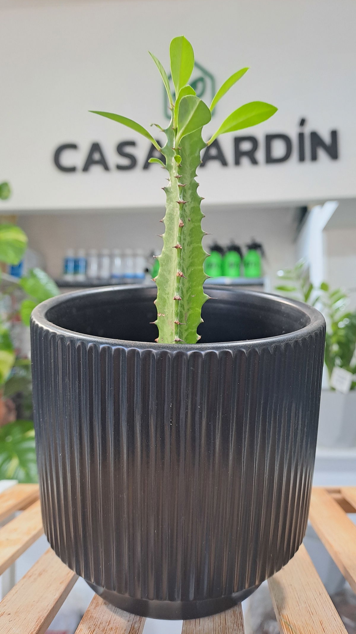 Descripción: Tallo vertical con forma triangular, ramificado. Aunque parece cactus, es una euphorbia.