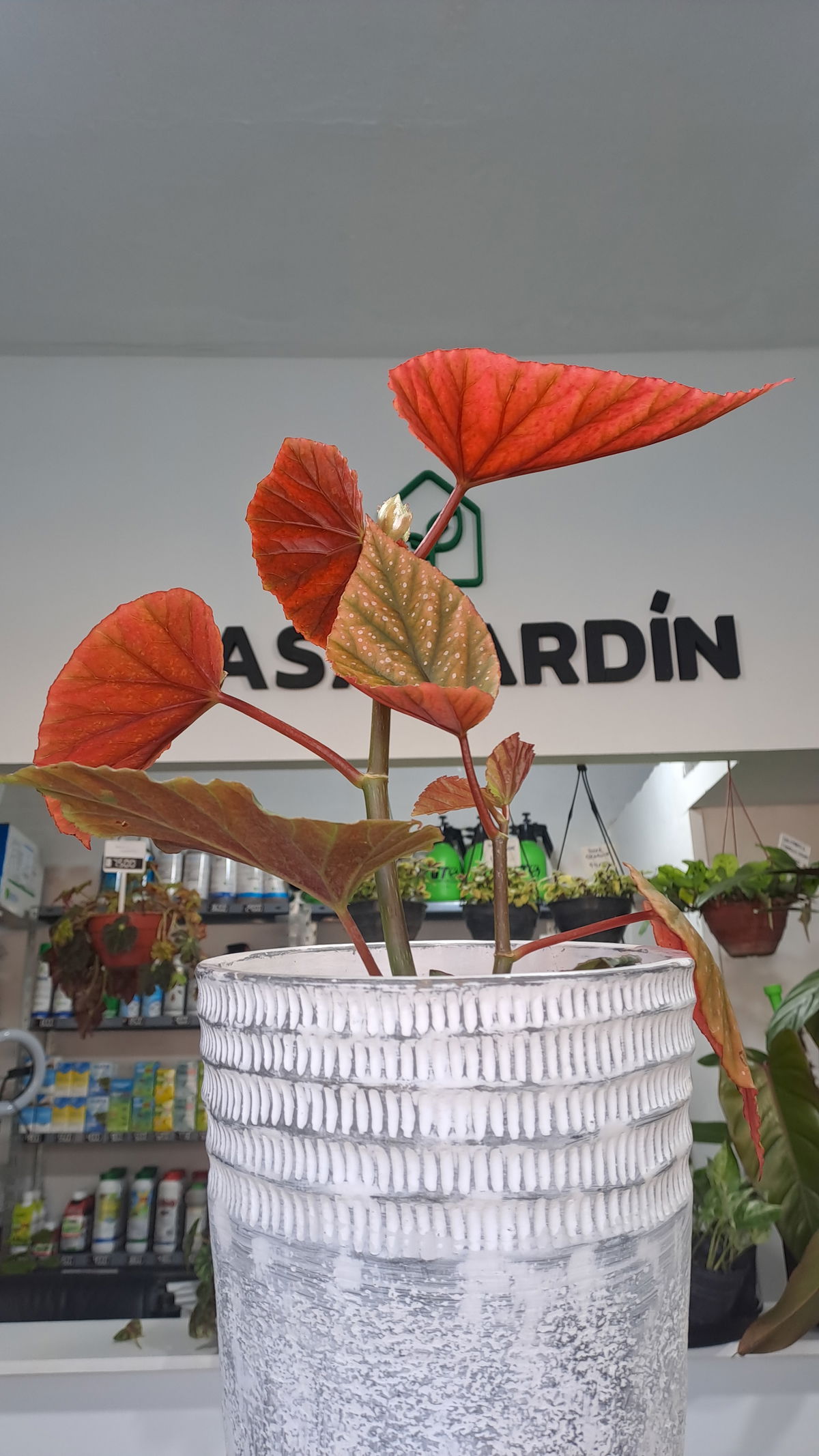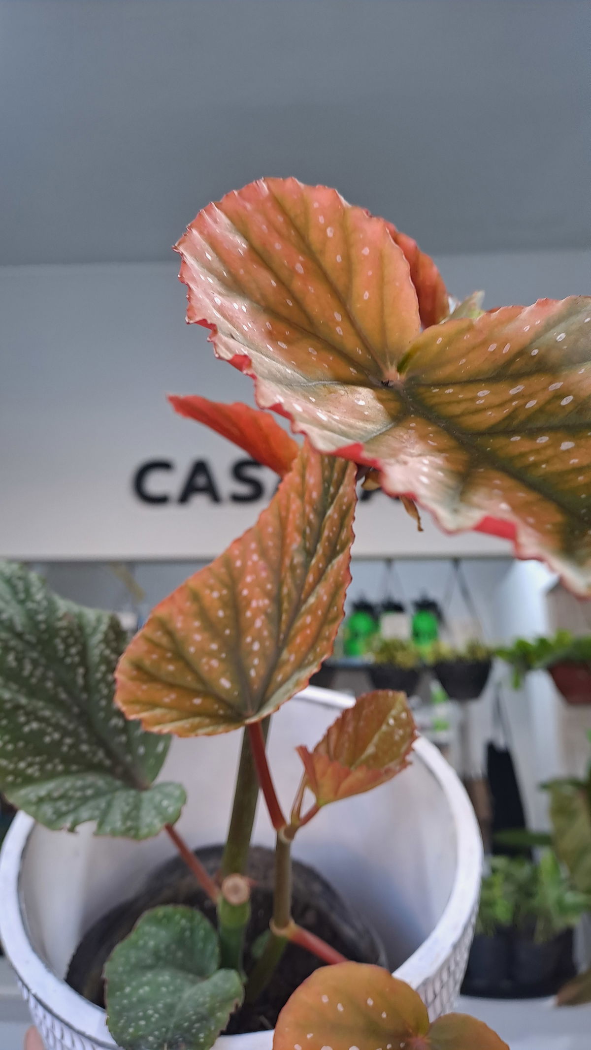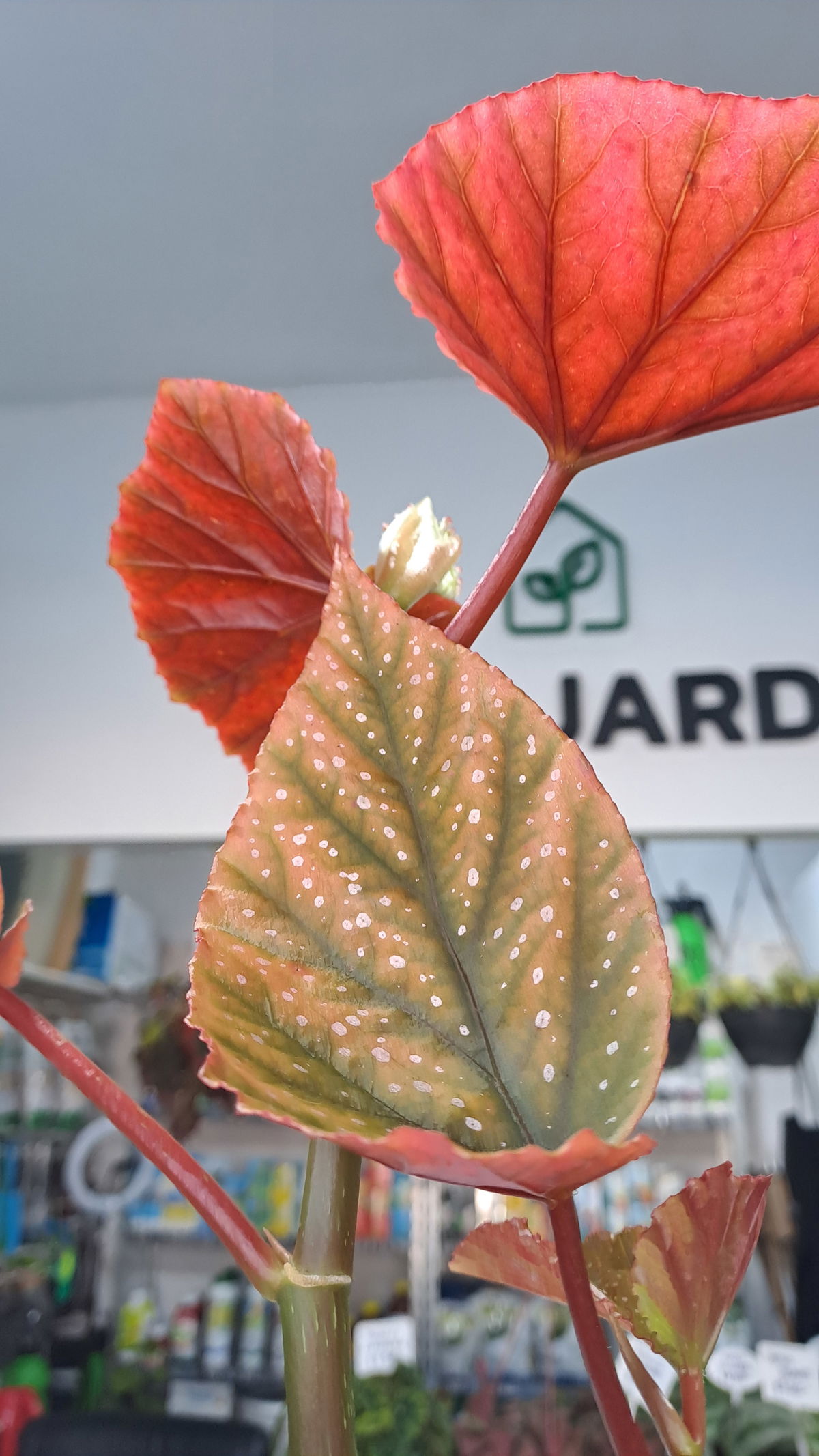 Descripción: Hojas verde oliva con manchitas rosadas y envés rojo púrpura. Tallos de begonia caña, muy ornamentales.