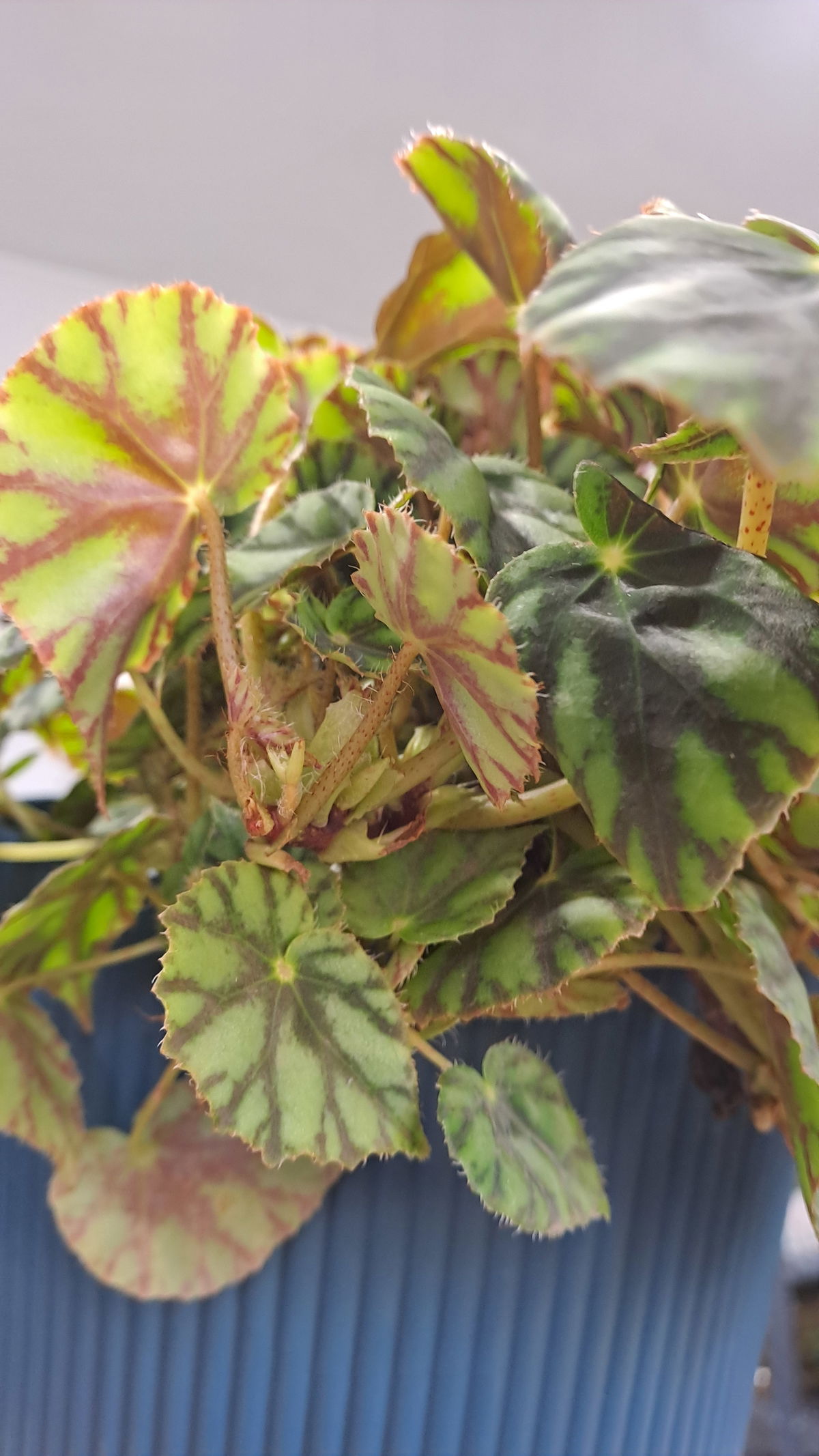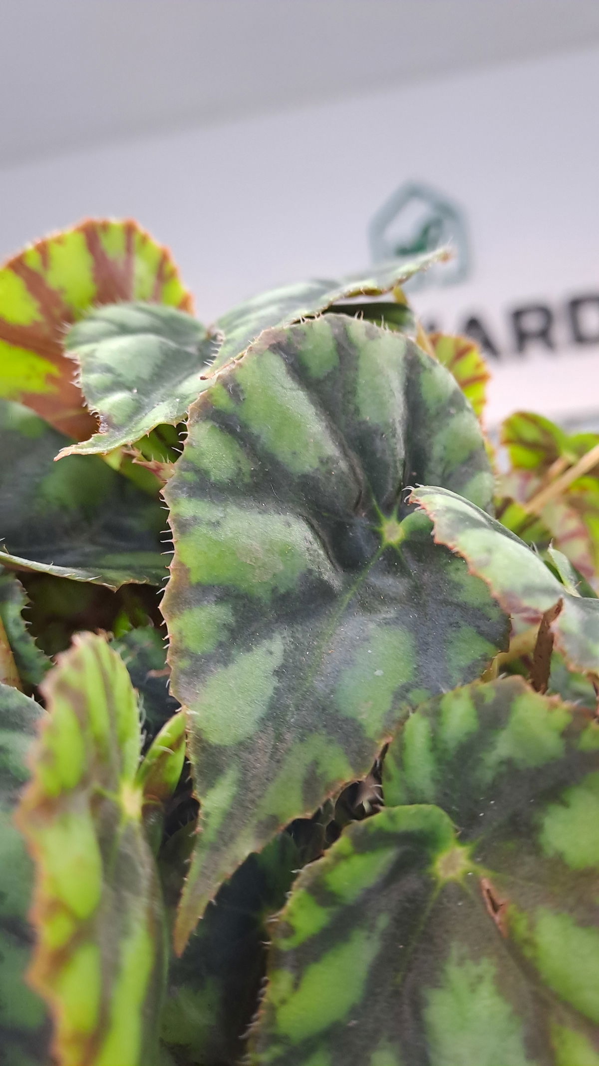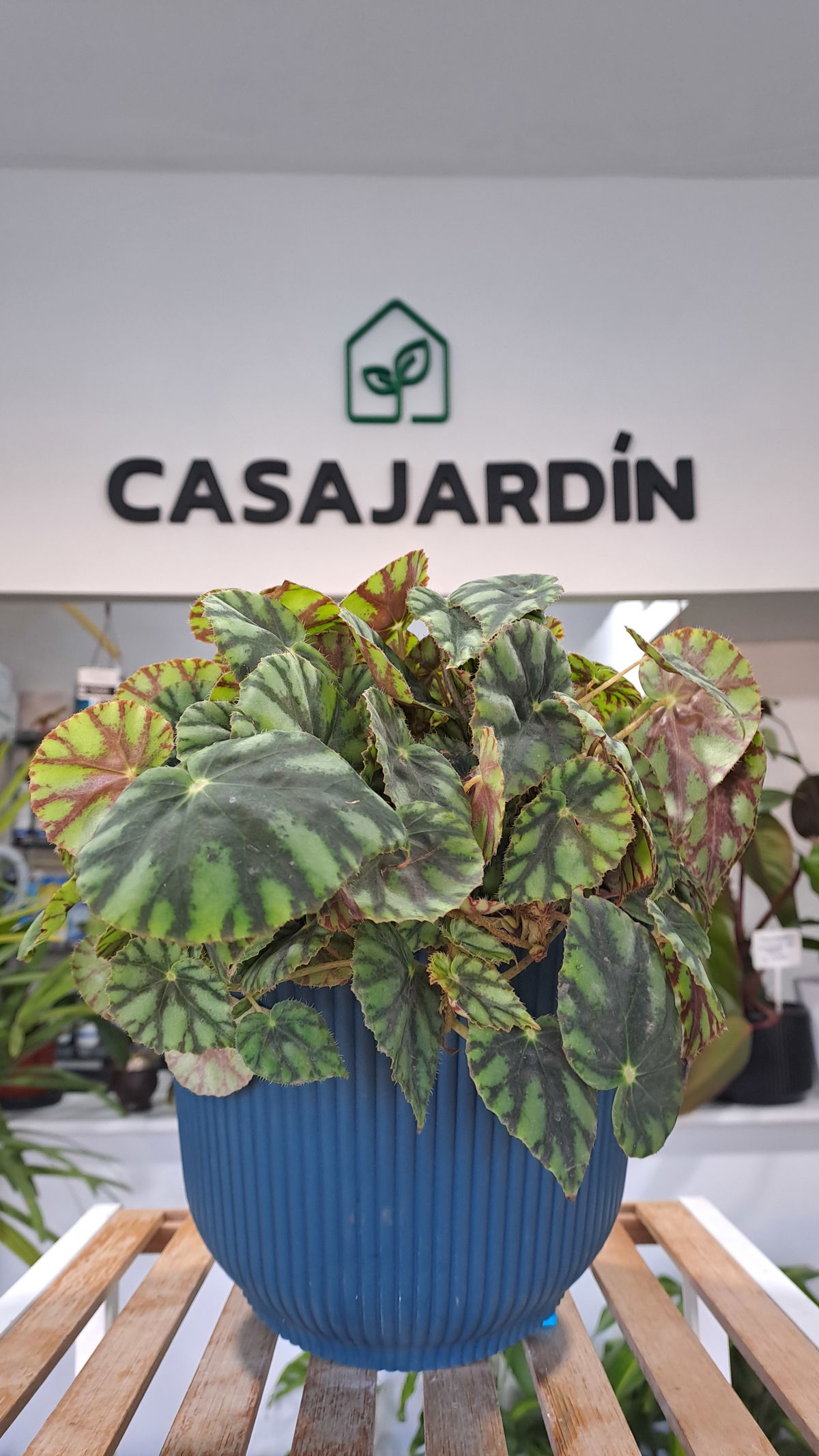 Descripción: Begonia rizomatosa de hojas ovaladas color chocolate con franjas verde y envés rojo, flores rosadas. Compacta y decorativa