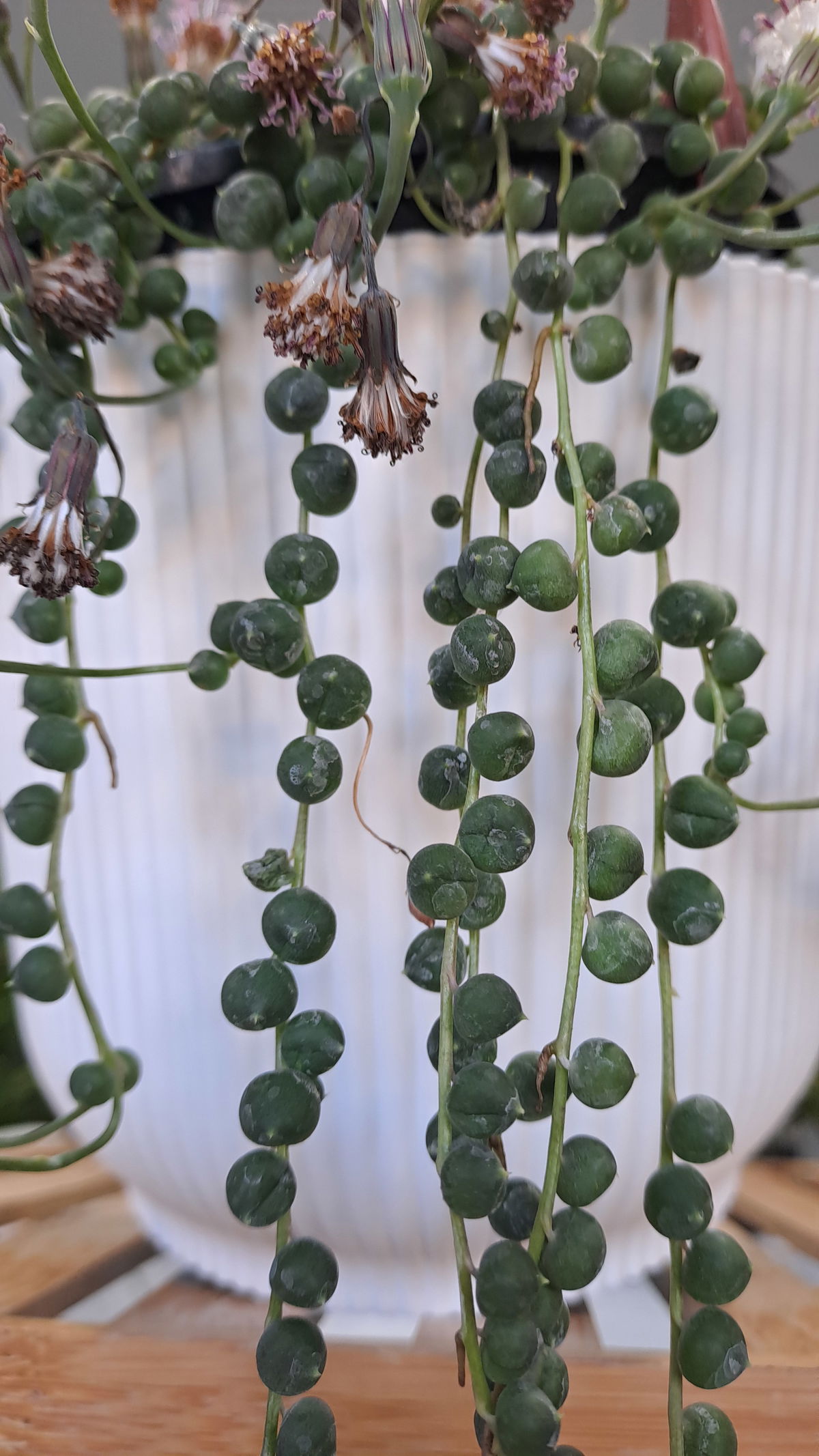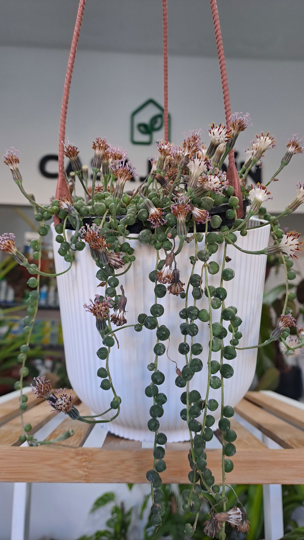 Descripción: Suculenta colgante con hojas esféricas como perlas que forman guirnaldas. Muy ornamental y fácil de mantener.