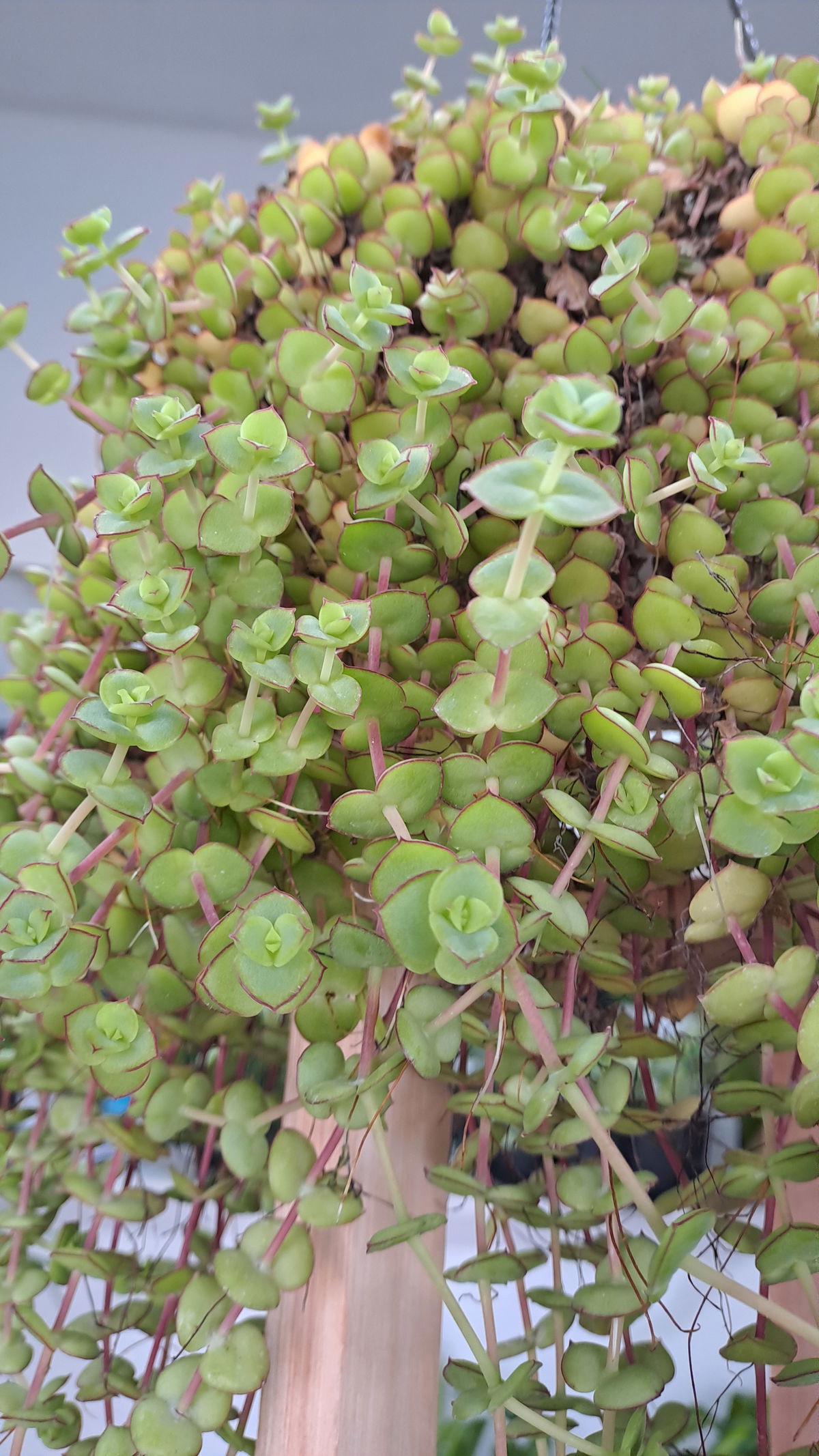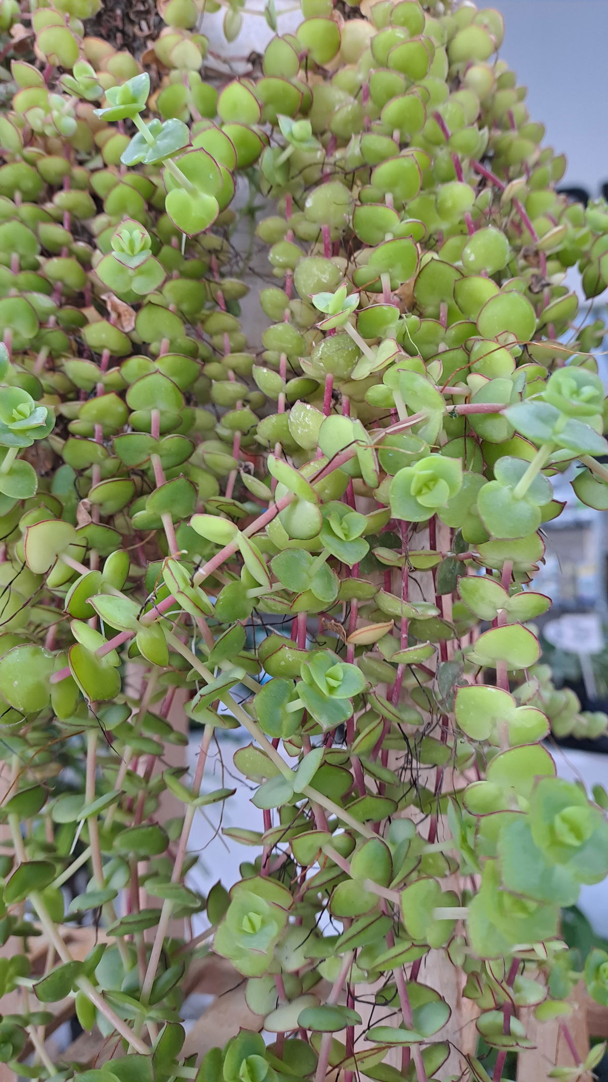 Descripción: Pequeña suculenta colgante, hojas pequeñas redondeadas color verde con reflejos púrpura, forma densas esteras.