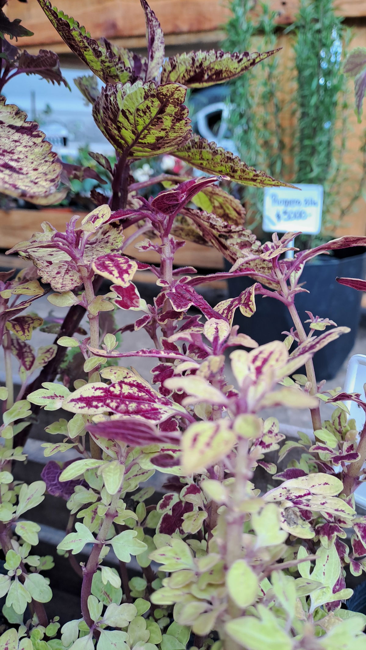 Descripción: Planta de hojas grandes, aterciopeladas, con colores intensos (verde, púrpura, rojo, amarillo).