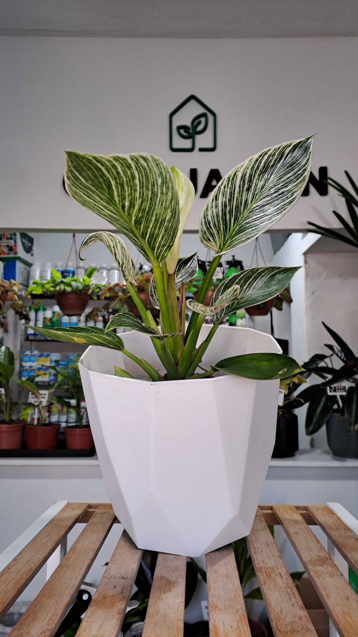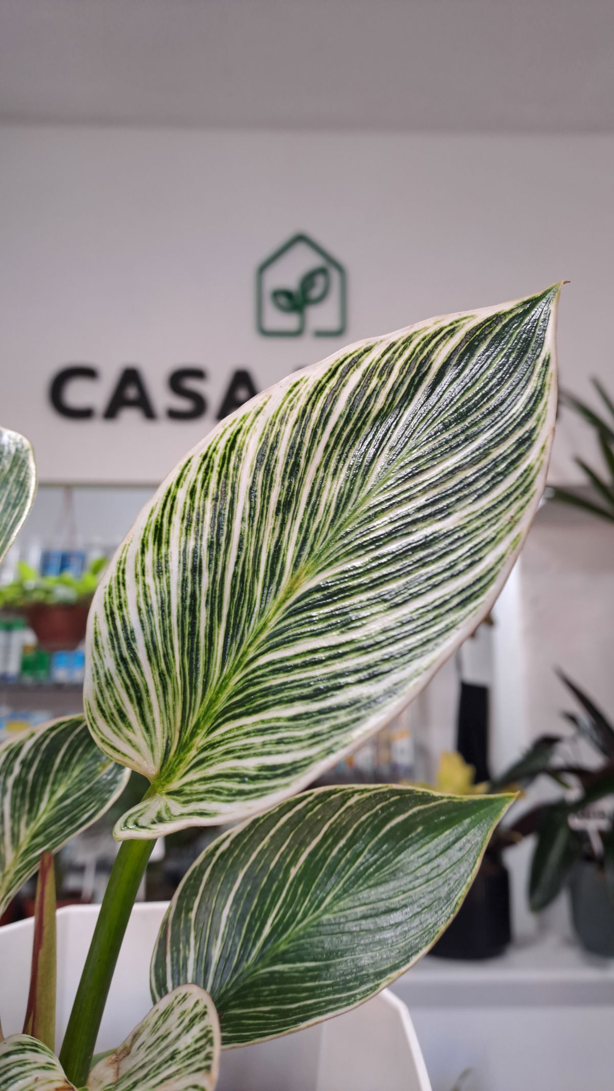 Cuidados: Luz indirecta brillante para mantener las rayas, riego moderado, evitar encharcar, interior.