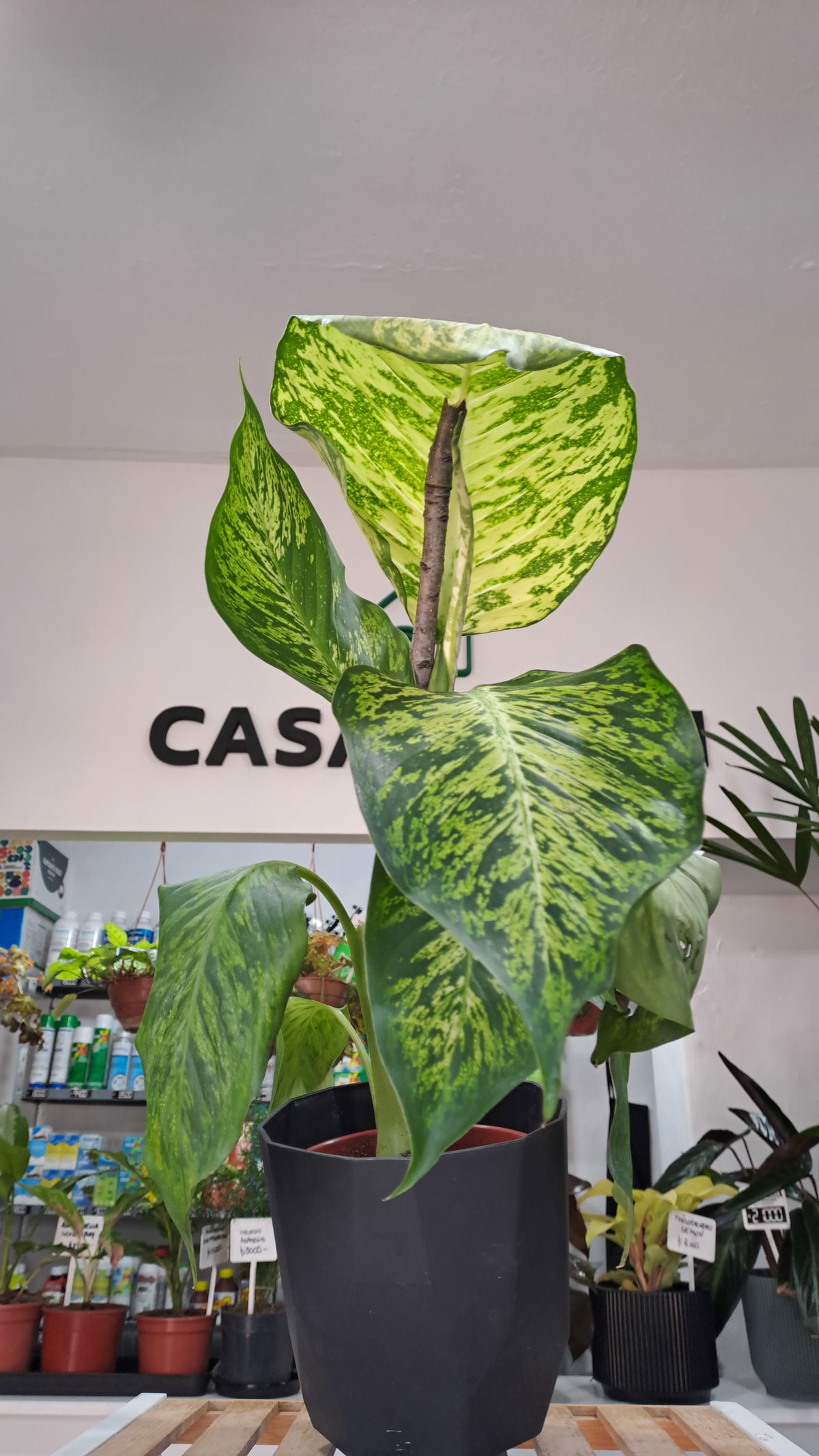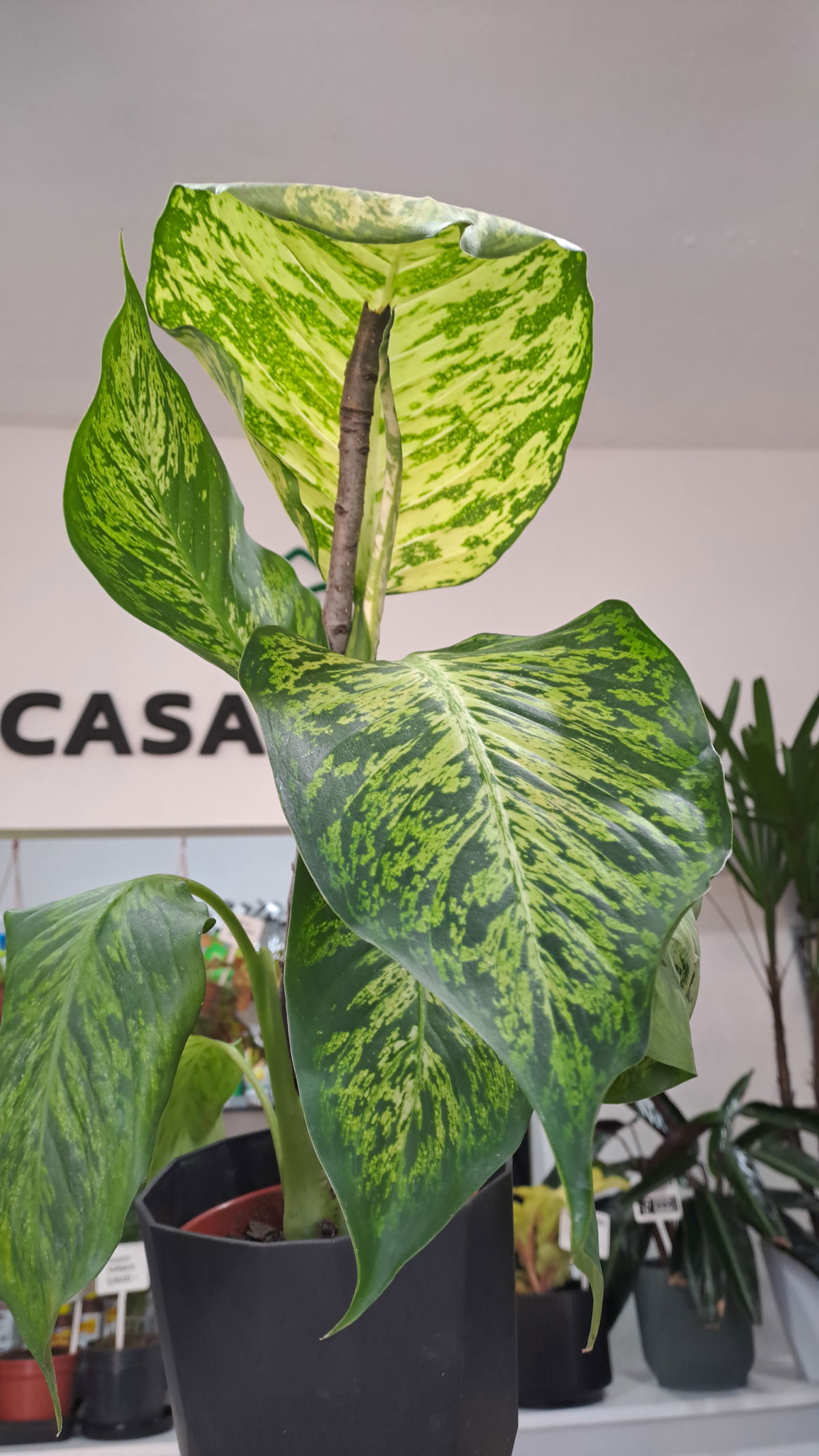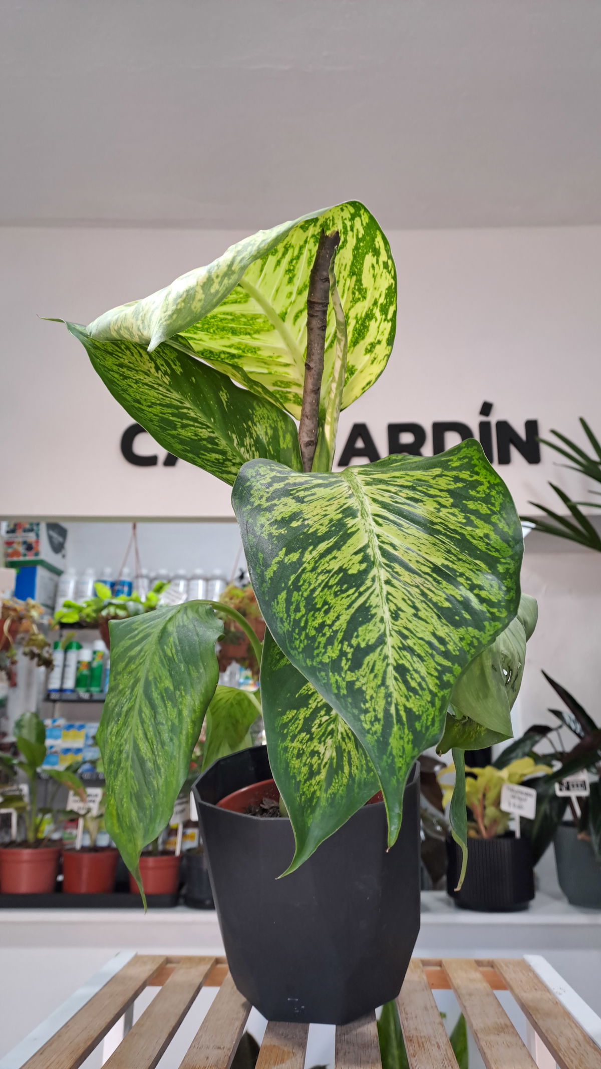 Descripción: Planta de follaje grande y decorativo con manchas crema/verde, crecimiento en forma de tronco; clásica de interiores por su presencia.